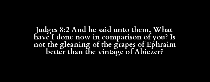 Judges 8:2 And he said unto them, What have I done now in comparison of you? Is not the gleaning of the grapes of Ephraim better than the vintage of Abiezer?