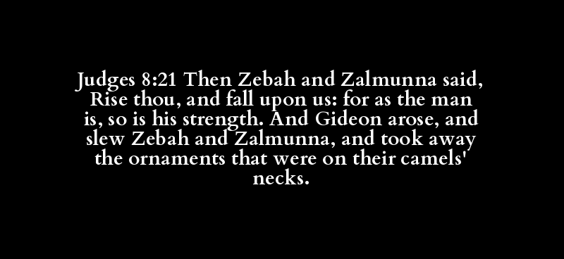 Judges 8:21 Then Zebah and Zalmunna said, Rise thou, and fall upon us: for as the man is, so is his strength. And Gideon arose, and slew Zebah and Zalmunna, and took away the ornaments that were on their camels' necks.