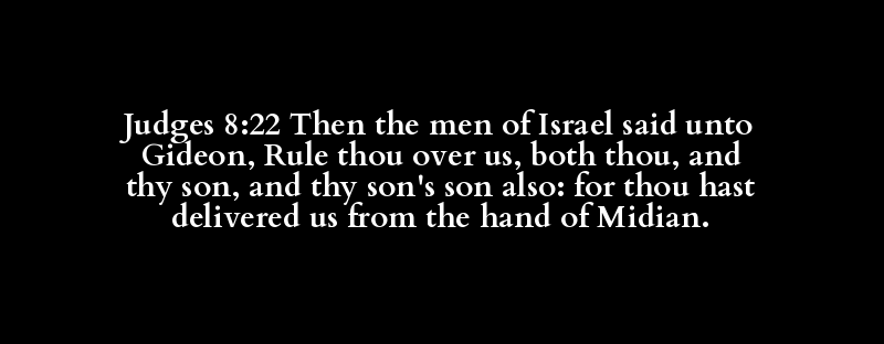 Judges 8:22 Then the men of Israel said unto Gideon, Rule thou over us, both thou, and thy son, and thy son's son also: for thou hast delivered us from the hand of Midian.