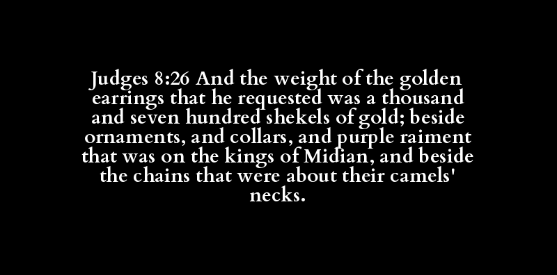 Judges 8:26 And the weight of the golden earrings that he requested was a thousand and seven hundred shekels of gold; beside ornaments, and collars, and purple raiment that was on the kings of Midian, and beside the chains that were about their camels' necks.
