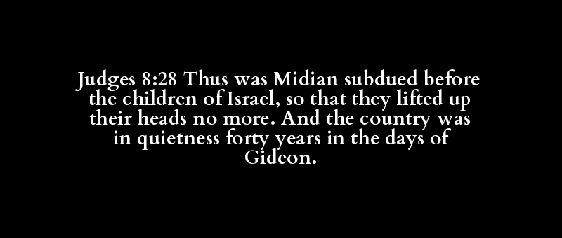 Judges 8:28 Thus was Midian subdued before the children of Israel, so that they lifted up their heads no more. And the country was in quietness forty years in the days of Gideon.