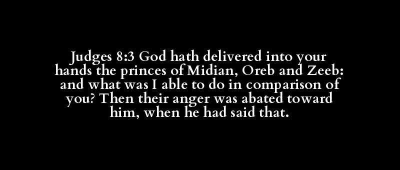 Judges 8:3 God hath delivered into your hands the princes of Midian, Oreb and Zeeb: and what was I able to do in comparison of you? Then their anger was abated toward him, when he had said that.