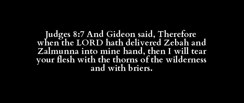 Judges 8:7 And Gideon said, Therefore when the LORD hath delivered Zebah and Zalmunna into mine hand, then I will tear your flesh with the thorns of the wilderness and with briers.