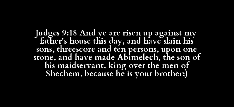 Judges 9:18 And ye are risen up against my father's house this day, and have slain his sons, threescore and ten persons, upon one stone, and have made Abimelech, the son of his maidservant, king over the men of Shechem, because he is your brother;)