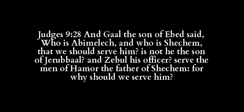 Judges 9:28 And Gaal the son of Ebed said, Who is Abimelech, and who is Shechem, that we should serve him? is not he the son of Jerubbaal? and Zebul his officer? serve the men of Hamor the father of Shechem: for why should we serve him?