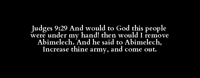 Judges 9:29 And would to God this people were under my hand! then would I remove Abimelech. And he said to Abimelech, Increase thine army, and come out.