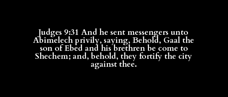 Judges 9:31 And he sent messengers unto Abimelech privily, saying, Behold, Gaal the son of Ebed and his brethren be come to Shechem; and, behold, they fortify the city against thee.