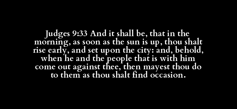 Judges 9:33 And it shall be, that in the morning, as soon as the sun is up, thou shalt rise early, and set upon the city: and, behold, when he and the people that is with him come out against thee, then mayest thou do to them as thou shalt find occasion.