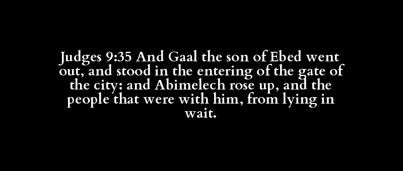 Judges 9:35 And Gaal the son of Ebed went out, and stood in the entering of the gate of the city: and Abimelech rose up, and the people that were with him, from lying in wait.