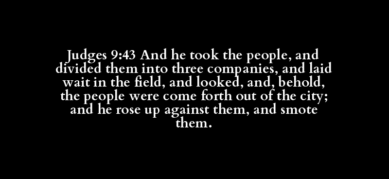 Judges 9:43 And he took the people, and divided them into three companies, and laid wait in the field, and looked, and, behold, the people were come forth out of the city; and he rose up against them, and smote them.