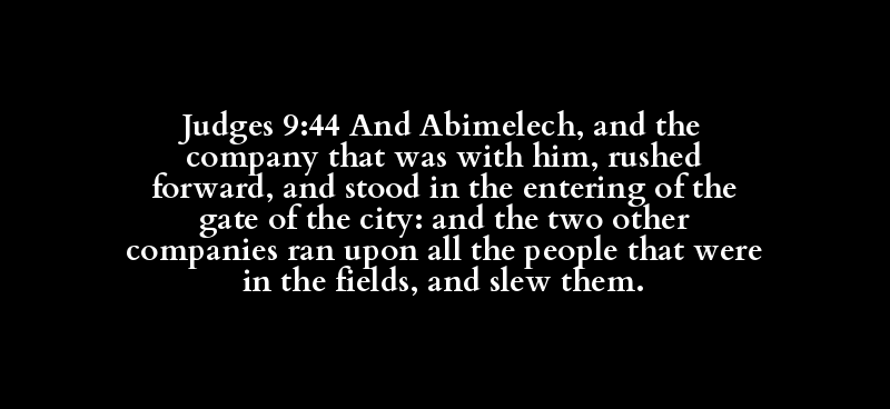 Judges 9:44 And Abimelech, and the company that was with him, rushed forward, and stood in the entering of the gate of the city: and the two other companies ran upon all the people that were in the fields, and slew them.