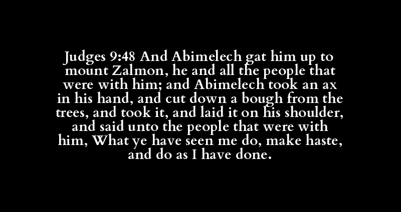 Judges 9:48 And Abimelech gat him up to mount Zalmon, he and all the people that were with him; and Abimelech took an ax in his hand, and cut down a bough from the trees, and took it, and laid it on his shoulder, and said unto the people that were with him, What ye have seen me do, make haste, and do as I have done.