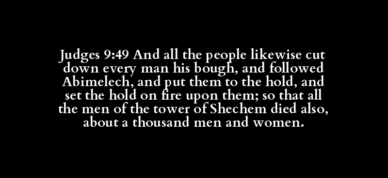 Judges 9:49 And all the people likewise cut down every man his bough, and followed Abimelech, and put them to the hold, and set the hold on fire upon them; so that all the men of the tower of Shechem died also, about a thousand men and women.