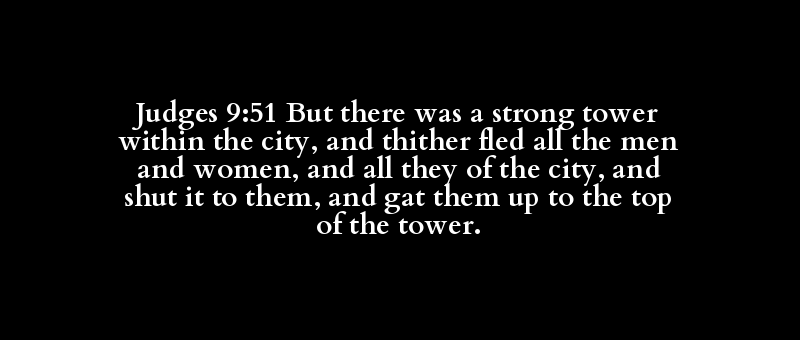Judges 9:51 But there was a strong tower within the city, and thither fled all the men and women, and all they of the city, and shut it to them, and gat them up to the top of the tower.