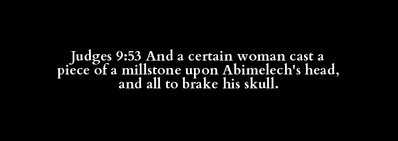 Judges 9:53 And a certain woman cast a piece of a millstone upon Abimelech's head, and all to brake his skull.