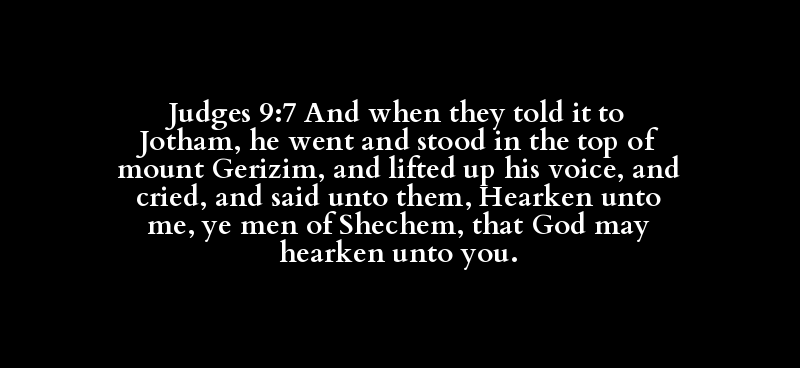 Judges 9:7 And when they told it to Jotham, he went and stood in the top of mount Gerizim, and lifted up his voice, and cried, and said unto them, Hearken unto me, ye men of Shechem, that God may hearken unto you.