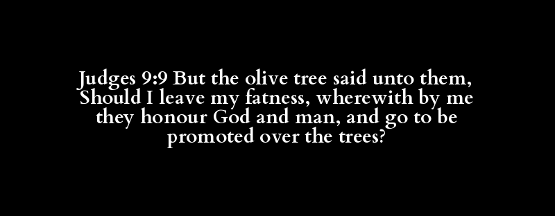 Judges 9:9 But the olive tree said unto them, Should I leave my fatness, wherewith by me they honour God and man, and go to be promoted over the trees?