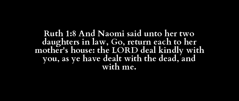 Ruth 1:8 And Naomi said unto her two daughters in law, Go, return each to her mother's house: the LORD deal kindly with you, as ye have dealt with the dead, and with me.