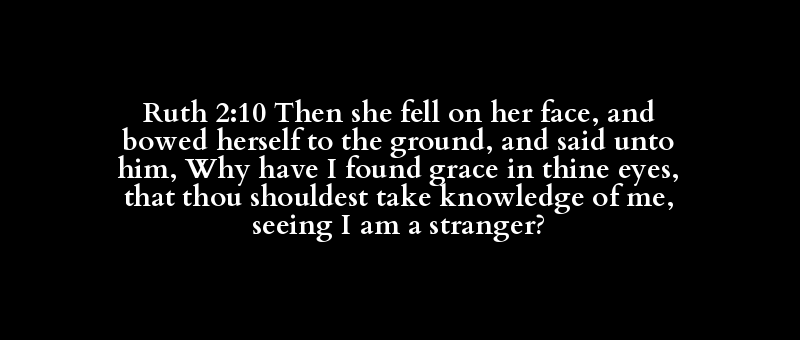 Ruth 2:10 Then she fell on her face, and bowed herself to the ground, and said unto him, Why have I found grace in thine eyes, that thou shouldest take knowledge of me, seeing I am a stranger?