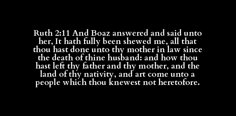 Ruth 2:11 And Boaz answered and said unto her, It hath fully been shewed me, all that thou hast done unto thy mother in law since the death of thine husband: and how thou hast left thy father and thy mother, and the land of thy nativity, and art come unto a people which thou knewest not heretofore.