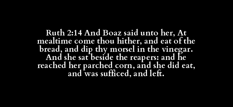 Ruth 2:14 And Boaz said unto her, At mealtime come thou hither, and eat of the bread, and dip thy morsel in the vinegar. And she sat beside the reapers: and he reached her parched corn, and she did eat, and was sufficed, and left.