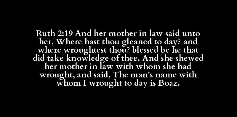 Ruth 2:19 And her mother in law said unto her, Where hast thou gleaned to day? and where wroughtest thou? blessed be he that did take knowledge of thee. And she shewed her mother in law with whom she had wrought, and said, The man's name with whom I wrought to day is Boaz.