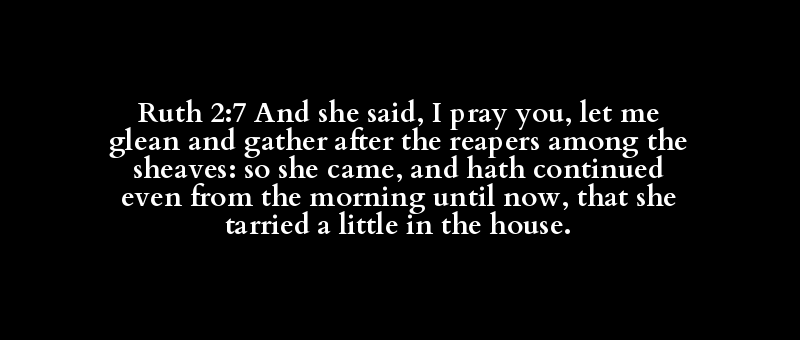 Ruth 2:7 And she said, I pray you, let me glean and gather after the reapers among the sheaves: so she came, and hath continued even from the morning until now, that she tarried a little in the house.