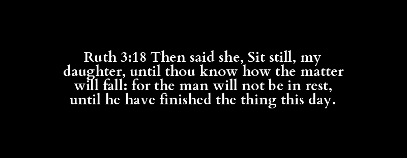 Ruth 3:18 Then said she, Sit still, my daughter, until thou know how the matter will fall: for the man will not be in rest, until he have finished the thing this day.
