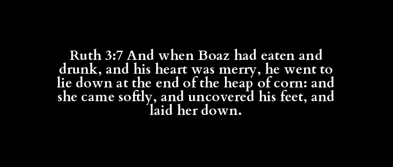 Ruth 3:7 And when Boaz had eaten and drunk, and his heart was merry, he went to lie down at the end of the heap of corn: and she came softly, and uncovered his feet, and laid her down.