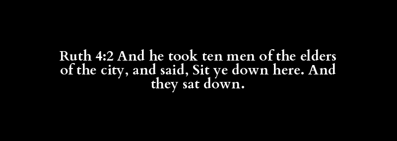 Ruth 4:2 And he took ten men of the elders of the city, and said, Sit ye down here. And they sat down.