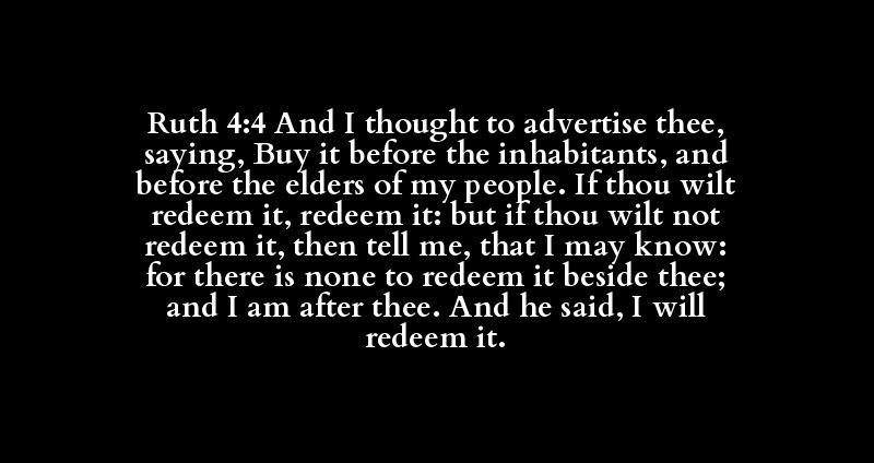 Ruth 4:4 And I thought to advertise thee, saying, Buy it before the inhabitants, and before the elders of my people. If thou wilt redeem it, redeem it: but if thou wilt not redeem it, then tell me, that I may know: for there is none to redeem it beside thee; and I am after thee. And he said, I will redeem it.