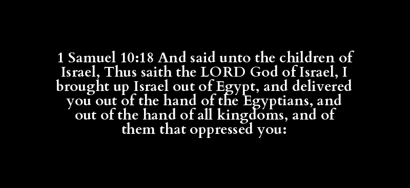 1 Samuel 10:18 And said unto the children of Israel, Thus saith the LORD God of Israel, I brought up Israel out of Egypt, and delivered you out of the hand of the Egyptians, and out of the hand of all kingdoms, and of them that oppressed you: