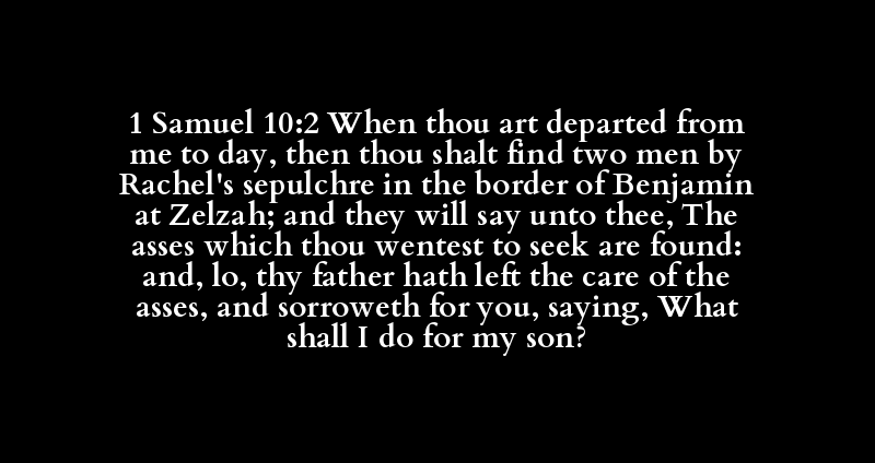 1 Samuel 10:2 When thou art departed from me to day, then thou shalt find two men by Rachel's sepulchre in the border of Benjamin at Zelzah; and they will say unto thee, The asses which thou wentest to seek are found: and, lo, thy father hath left the care of the asses, and sorroweth for you, saying, What shall I do for my son?