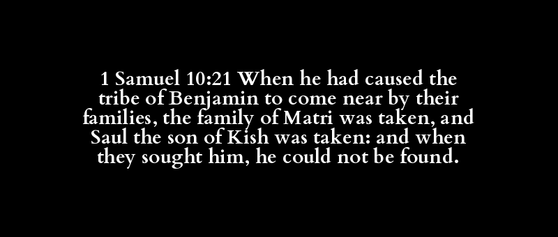 1 Samuel 10:21 When he had caused the tribe of Benjamin to come near by their families, the family of Matri was taken, and Saul the son of Kish was taken: and when they sought him, he could not be found.