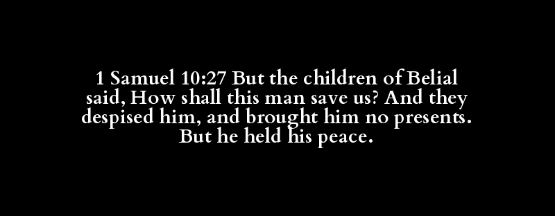1 Samuel 10:27 But the children of Belial said, How shall this man save us? And they despised him, and brought him no presents. But he held his peace.