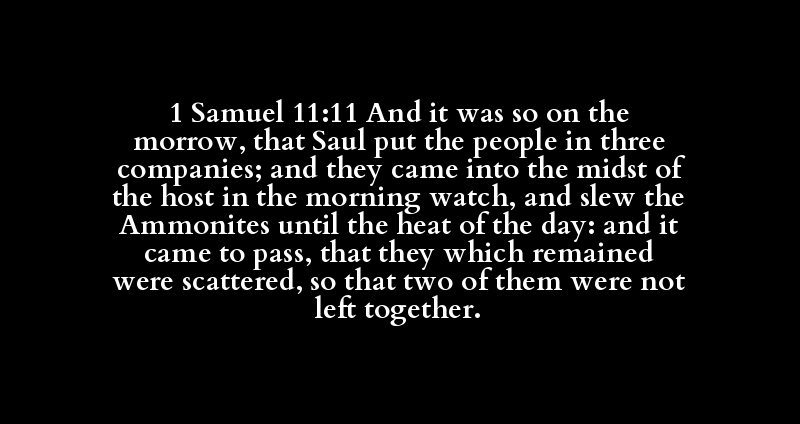 1 Samuel 11:11 And it was so on the morrow, that Saul put the people in three companies; and they came into the midst of the host in the morning watch, and slew the Ammonites until the heat of the day: and it came to pass, that they which remained were scattered, so that two of them were not left together.