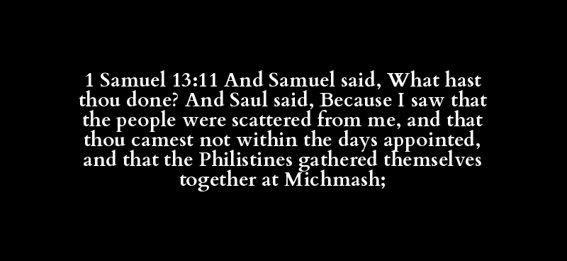 1 Samuel 13:11 And Samuel said, What hast thou done? And Saul said, Because I saw that the people were scattered from me, and that thou camest not within the days appointed, and that the Philistines gathered themselves together at Michmash;