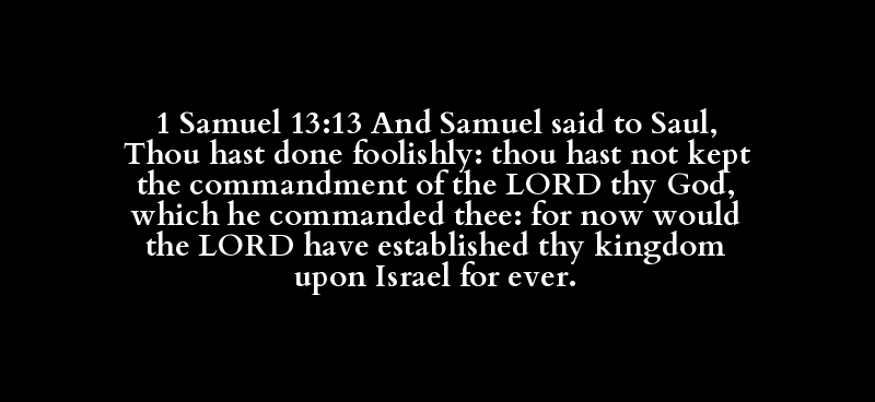 1 Samuel 13:13 And Samuel said to Saul, Thou hast done foolishly: thou hast not kept the commandment of the LORD thy God, which he commanded thee: for now would the LORD have established thy kingdom upon Israel for ever.