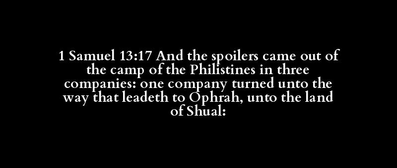 1 Samuel 13:17 And the spoilers came out of the camp of the Philistines in three companies: one company turned unto the way that leadeth to Ophrah, unto the land of Shual: