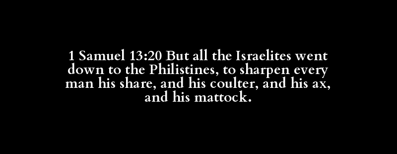 1 Samuel 13:20 But all the Israelites went down to the Philistines, to sharpen every man his share, and his coulter, and his ax, and his mattock.