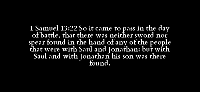 1 Samuel 13:22 So it came to pass in the day of battle, that there was neither sword nor spear found in the hand of any of the people that were with Saul and Jonathan: but with Saul and with Jonathan his son was there found.