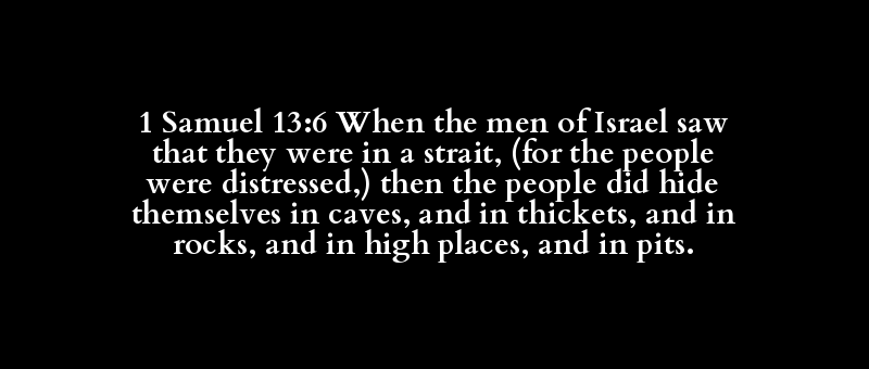 1 Samuel 13:6 When the men of Israel saw that they were in a strait, (for the people were distressed,) then the people did hide themselves in caves, and in thickets, and in rocks, and in high places, and in pits.