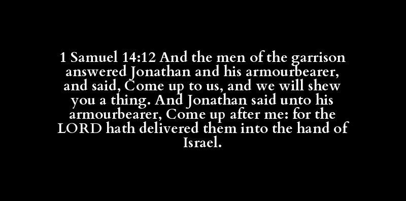 1 Samuel 14:12 And the men of the garrison answered Jonathan and his armourbearer, and said, Come up to us, and we will shew you a thing. And Jonathan said unto his armourbearer, Come up after me: for the LORD hath delivered them into the hand of Israel.