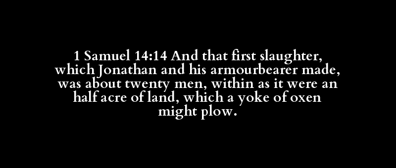 1 Samuel 14:14 And that first slaughter, which Jonathan and his armourbearer made, was about twenty men, within as it were an half acre of land, which a yoke of oxen might plow.