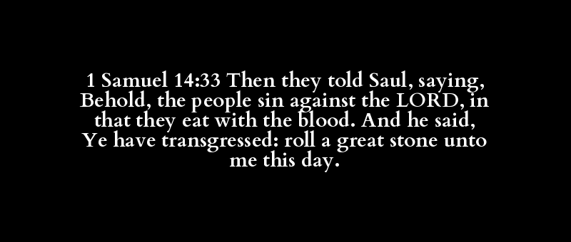 1 Samuel 14:33 Then they told Saul, saying, Behold, the people sin against the LORD, in that they eat with the blood. And he said, Ye have transgressed: roll a great stone unto me this day.