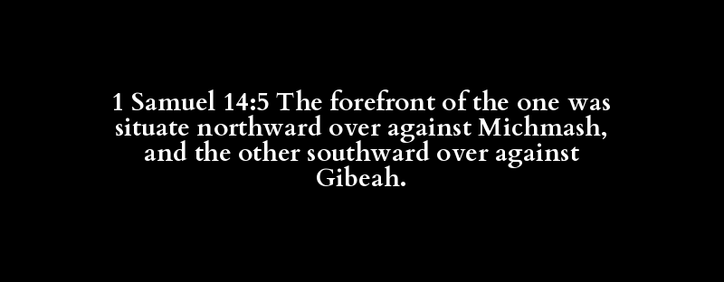 1 Samuel 14:5 The forefront of the one was situate northward over against Michmash, and the other southward over against Gibeah.