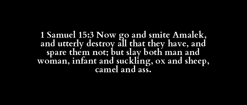 1 Samuel 15:3 Now go and smite Amalek, and utterly destroy all that they have, and spare them not; but slay both man and woman, infant and suckling, ox and sheep, camel and ass.