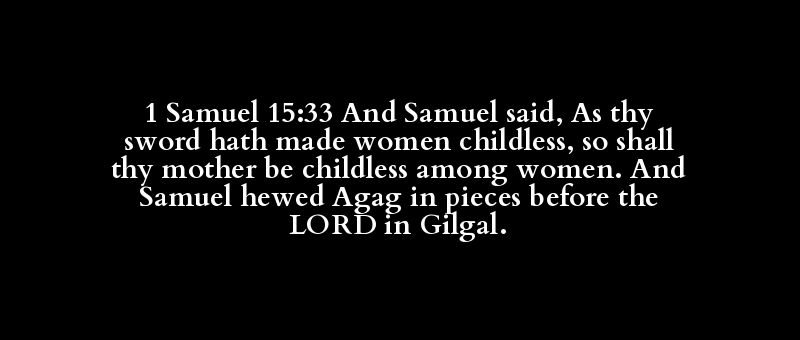 1 Samuel 15:33 And Samuel said, As thy sword hath made women childless, so shall thy mother be childless among women. And Samuel hewed Agag in pieces before the LORD in Gilgal.