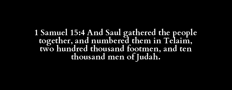 1 Samuel 15:4 And Saul gathered the people together, and numbered them in Telaim, two hundred thousand footmen, and ten thousand men of Judah.