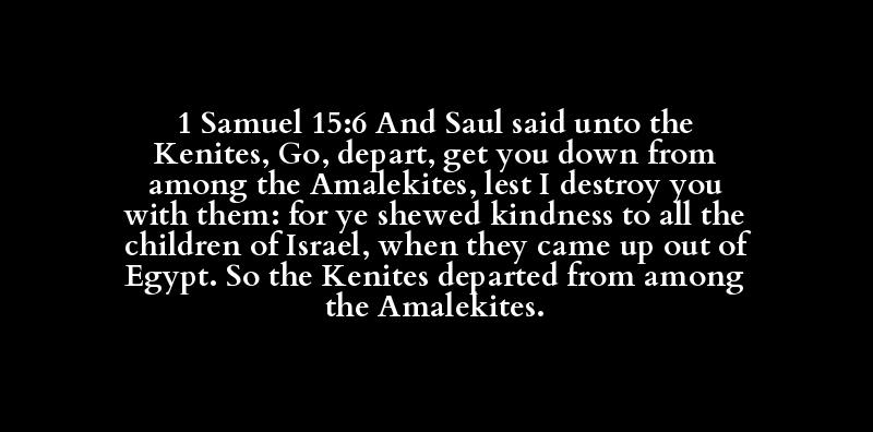 1 Samuel 15:6 And Saul said unto the Kenites, Go, depart, get you down from among the Amalekites, lest I destroy you with them: for ye shewed kindness to all the children of Israel, when they came up out of Egypt. So the Kenites departed from among the Amalekites.